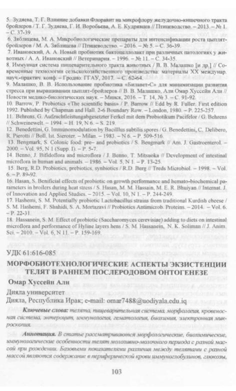كما نشر الدكتور عمر حسين علي بحثين علميين منفردين في مجلة علمية عالمية رصينة صادرة عن كلية الطب البيطري – جامعة غرودنو وهي مجلة الطب البيطري: مشاكل وآفاق (Veterinary Medicine: Problems and Prospects) حيث حمل البحث الأول عنوان “التحولات التكيفية عند استخدام البروبيوتيك” فيما تناول البحث الثاني “الجوانب المورفولوجية والتكنولوجية في مرحلة التكوين الجنيني المبكر بعد الولادة”.