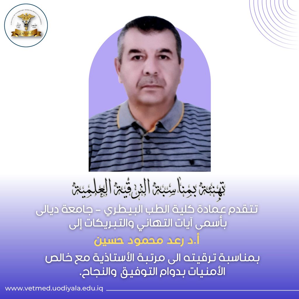 تتقدم عمادة كلية الطب البيطري – جامعة ديالى بأحرّ التهاني وأطيب التبريكات إلى الأستاذ الدكتور رعد محمود حسين بمناسبة حصوله على الترقية العلمية إلى مرتبة الأستاذية.