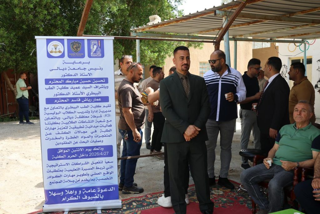 شهدت كلية الطب البيطري في جامعة ديالى يوم الاثنين الموافق 27 نيسان 2026 إقامة الفعالية الميدانية المشتركة مع مديرية (K9) في شرطة ديالى بحضور السيد رئيس جامعة ديالى الأستاذ الدكتور تحسين حسين مبارك وعميد الكلية الأستاذ الدكتور عمار رياض قاسم، إلى جانب معاون قائد شرطة ديالى العميد جمال احمد ابراهيم، ومدير قسم إدارة وتدريب الكلاب البوليسية في ديالى العميد رياض أحمد خلف.