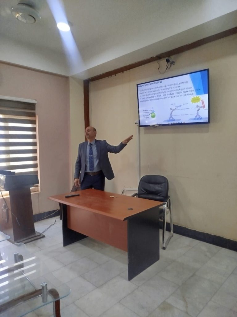 وحاضر في الورشة الأستاذ المساعد الدكتور رمزي عبد الغفور عبود حيث تناول خلالها الأسس العلمية للتقنيات المناعية المعتمدة على التفاعل النوعي بين الأجسام المضادة والمستضدات موضحًا آليات استخدامها في الكشف عن المستضدات داخل الخلايا والأنسجة وأهم تطبيقاتها في المجالات التشخيصية والبحثية.