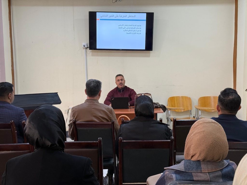 وأُلقيت في الندوة محاضرة قدّمها م.م. أحمد ناجي استعرض فيها أبرز التحديات المناخية التي يشهدها العالم والمنطقة ولاسيما الانعكاسات المباشرة على الأمن الغذائي