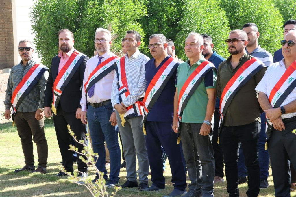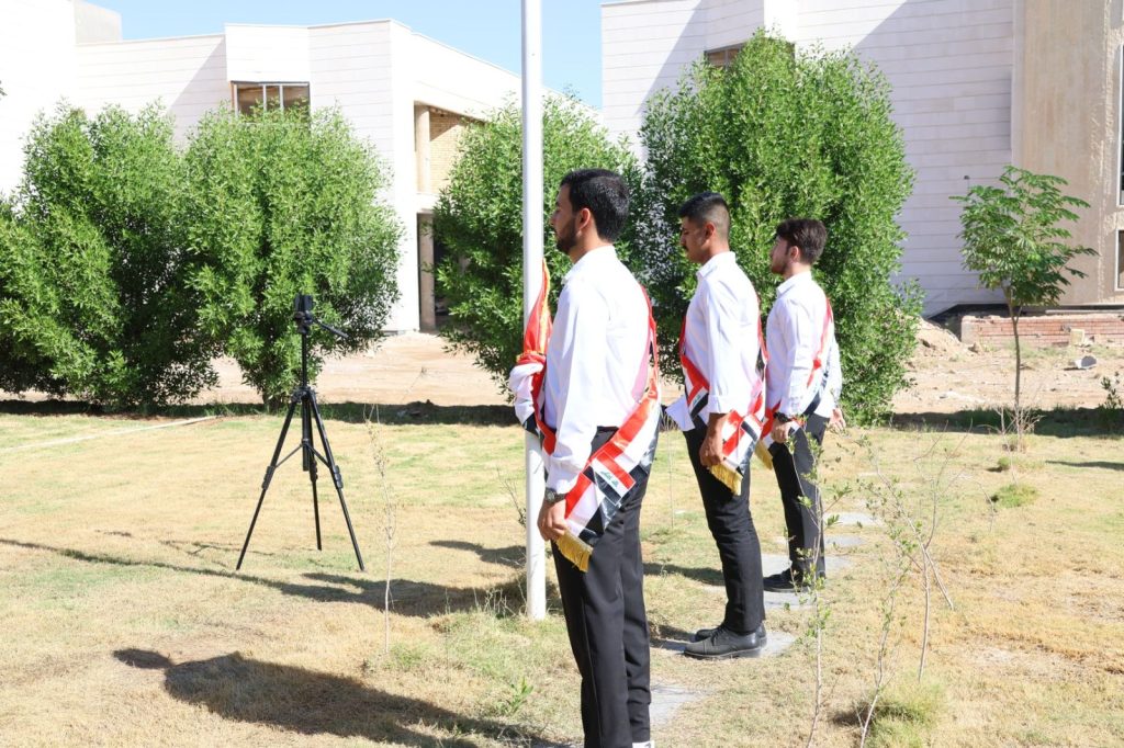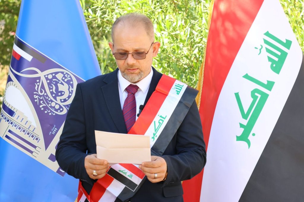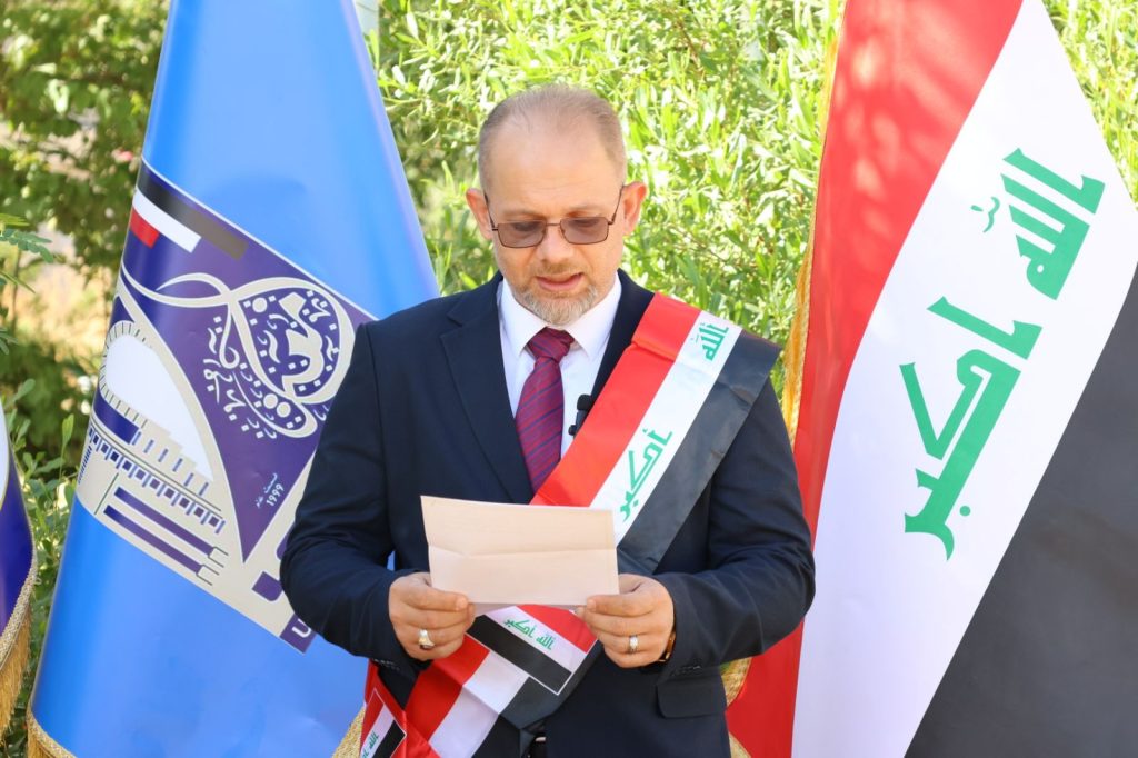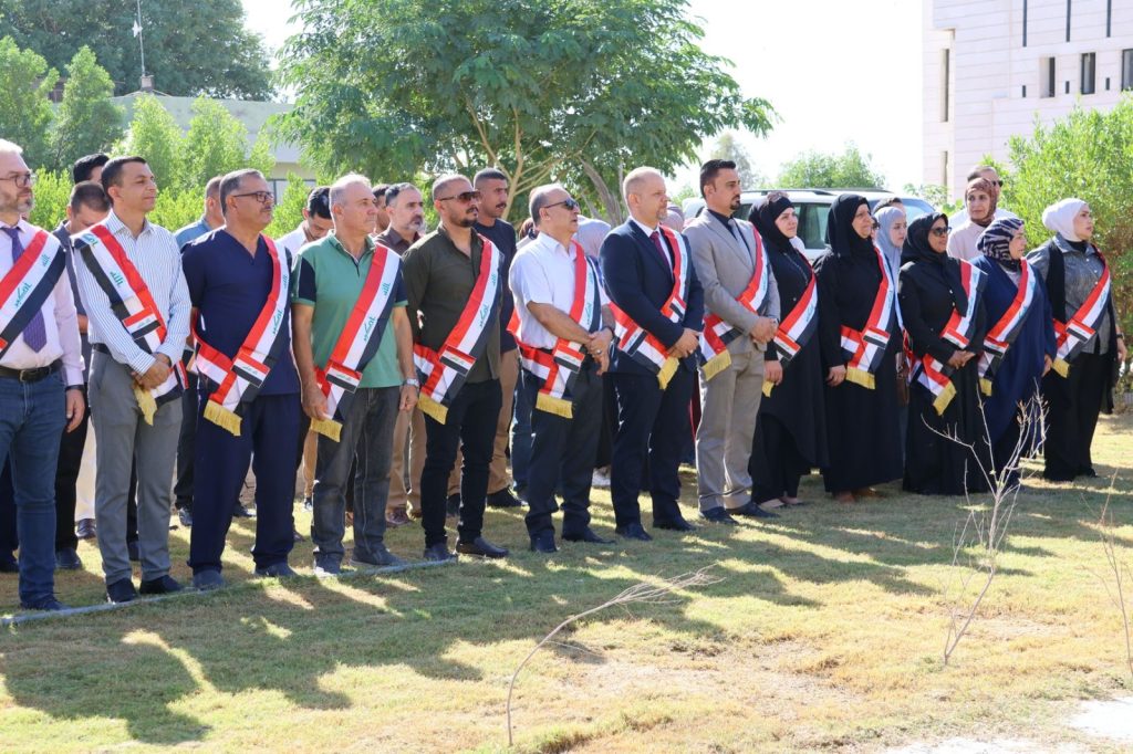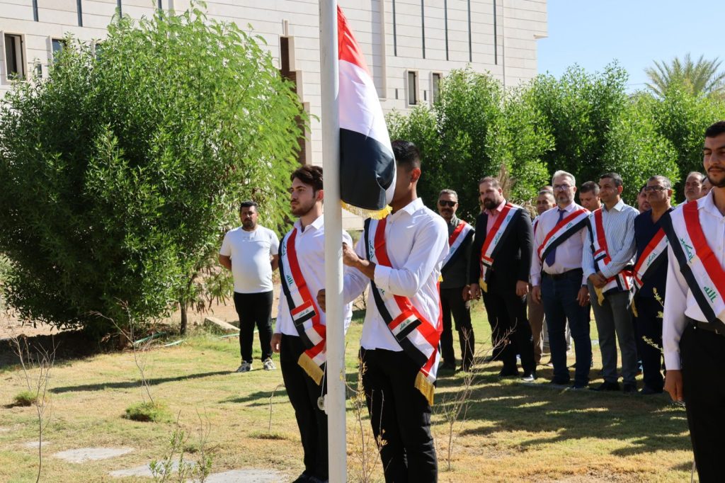 • وقفة احتفالية بمناسبة اليوم الوطني العراقيأقامت كلية الطب البيطري في جامعة ديالى اليوم الخميس الموافق 2 تشرين الأول 2025 وقفة احتفالية مركزية بمناسبة اليوم الوطني العراقي وذلك بحضور السيد عميد الكلية الأستاذ الدكتور عمار رياض قاسم المحترم ومعاونيه ورؤساء الفروع العلمية وأعضاء الهيئة التدريسية والمنتسبين وجمع غفير من الطلبة.استهلت المراسم بتلاوة آياتٍ من الذكر الحكيم وقراءة سورة الفاتحة ترحماً على أرواح شهداء العراق الأبرار أعقبها عزف النشيد الوطني العراقي وسط أجواء مفعمة بالاعتزاز والفخر بالانتماء الوطني.وفي كلمة له بالمناسبة أكد السيد عميد الكلية الأستاذ الدكتور عمار رياض قاسم أن اليوم الوطني العراقي يمثل محطة خالدة في تاريخ العراق وفرصة لتجديد العهد والوفاء للوطن ولشهدائه الأبرار الذين قدّموا دماءهم الزكية دفاعاً عن وحدة البلاد وسيادتها. وأوضح أن الشعب العراقي سطّر عبر تاريخه الطويل أروع صور البطولة والفداء وأن مسؤولية الحاضر تتمثل في مواصلة مسيرة البناء مستلهمين من تضحيات الشهداء قوةً تدفع نحو مستقبل أفضل.كما شدد سيادته على أن الجامعة هي القلب النابض لمسيرة البناء والإعمار ورافد أساسي في إعداد جيل واعٍ مسلح بالعلم والمعرفة قادر على النهوض بالمجتمع ومؤسسات الدولة، مؤكداً أن رسالة الكلية لا تقتصر على التعليم فقط بل تمتد لتشمل تعزيز القيم الوطنية وترسيخ روح المواطنة الصالحة وبناء الإنسان الذي يمثل أساس كل نهضة وتقدم.كما تضمنت الفعالية رفع العلم العراقي فوق بناية الكلية وفي حديقة الكلية جرت مراسم رفع العلم من قبل الفريق الكشفي بالتزامن مع عزف النشيد الوطني في لوحة وطنية جسدت معاني الولاء والانتماء.واختتمت الوقفة بالدعاء للعراق وشعبه الكريم بدوام الأمن والاستقرار والتقدم مؤكدين أن هذا اليوم سيبقى علامة مضيئة في تاريخ العراق ورمزاً راسخاً لهويته الوطنية ووحدته.