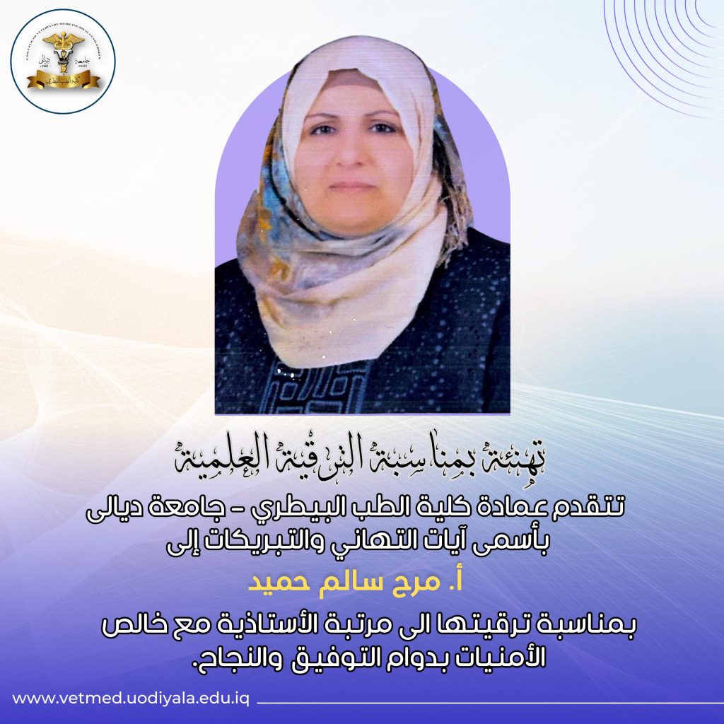تتقدم عمادة كلية الطب البيطري – جامعة ديالى بأحرّ التهاني وأطيب التبريكات إلى أ. مرح سالم حميد بمناسبة ترقيتها الى مرتبة الأستاذية.