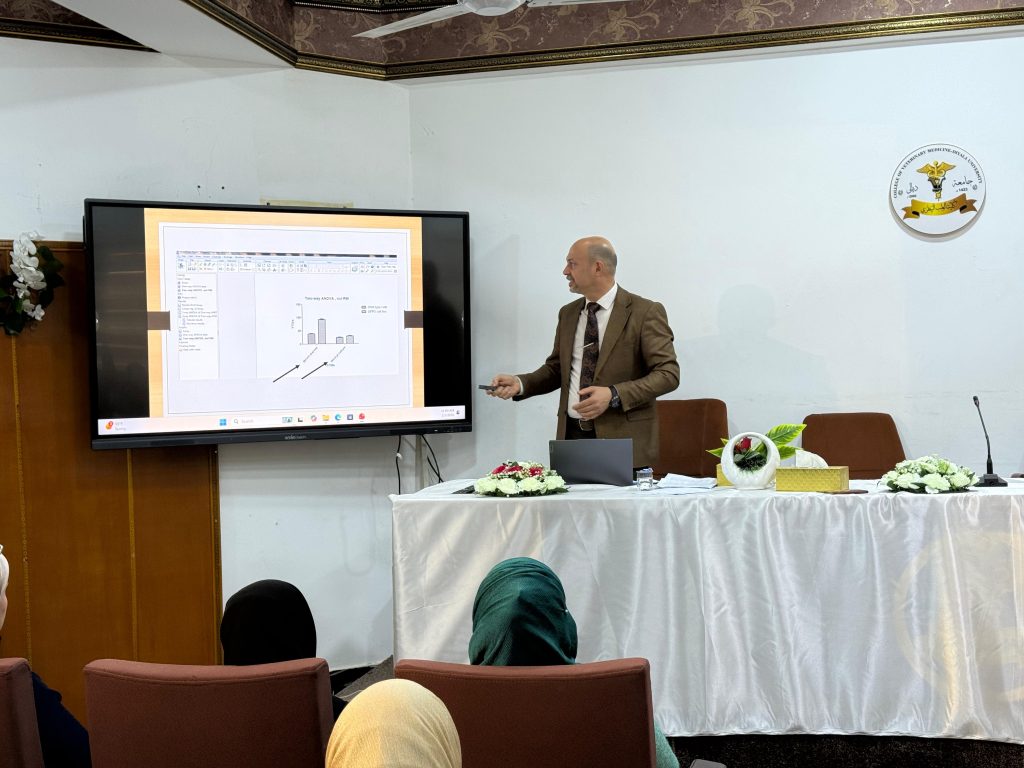 أقامت كلية الطب البيطري، اليوم الخميس الموافق 5 شباط 2026 ورشة علمية متخصصة ضمن المنظومة الإلكترونية لبرنامج تطوير المهارات للباحثين تناولت آليات وإمكانات استخدام برنامج GraphPad Prism في التحليل الإحصائي وعرض النتائج البحثية.